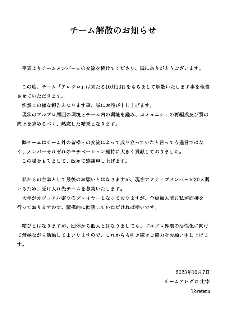 これ主宰とやらが引退して誰も後引き継がなかったとかじゃなくて失敗チームになったから投げ捨てる感じ?
